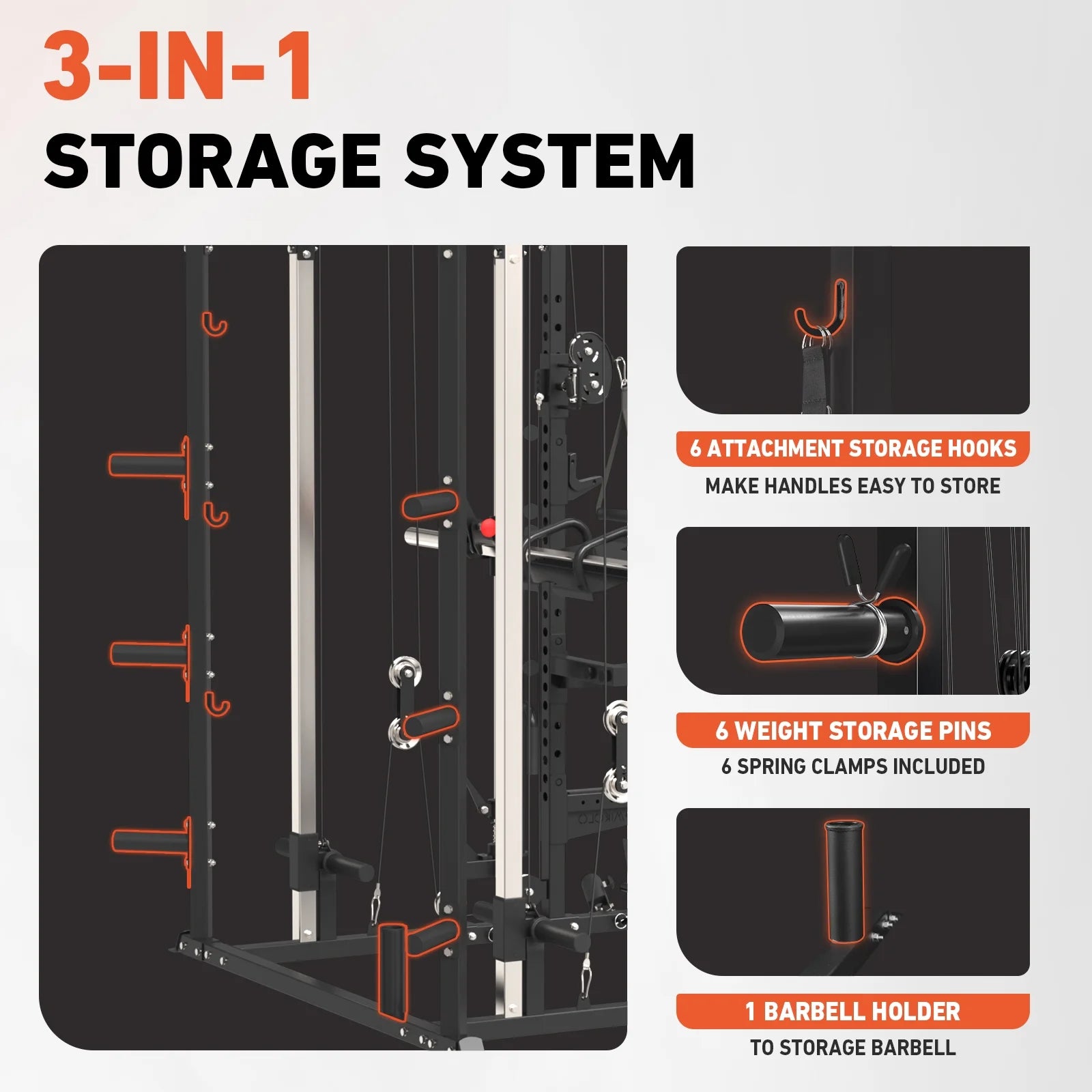 - COMPACT AND ECONOMICAL CHOICE: Occupying just 20 square feet, the smith machine is enhanced with six weight storage pegs, a barbell holder, and six storage hooks for temporarily placing unused weight plates and other accessories. A broader exercise range effectively activates more muscles. The raised pull-up bar caters to different heights, ensuring a professional training experience for all.